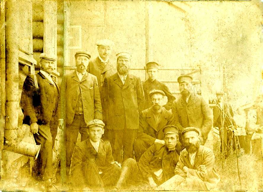 Служащие ф-ки С.И. Четверикова. П.П.Чернышёв сидит на земле, крайний справа. Фото 4 августа 1906 г. в Городищах.
