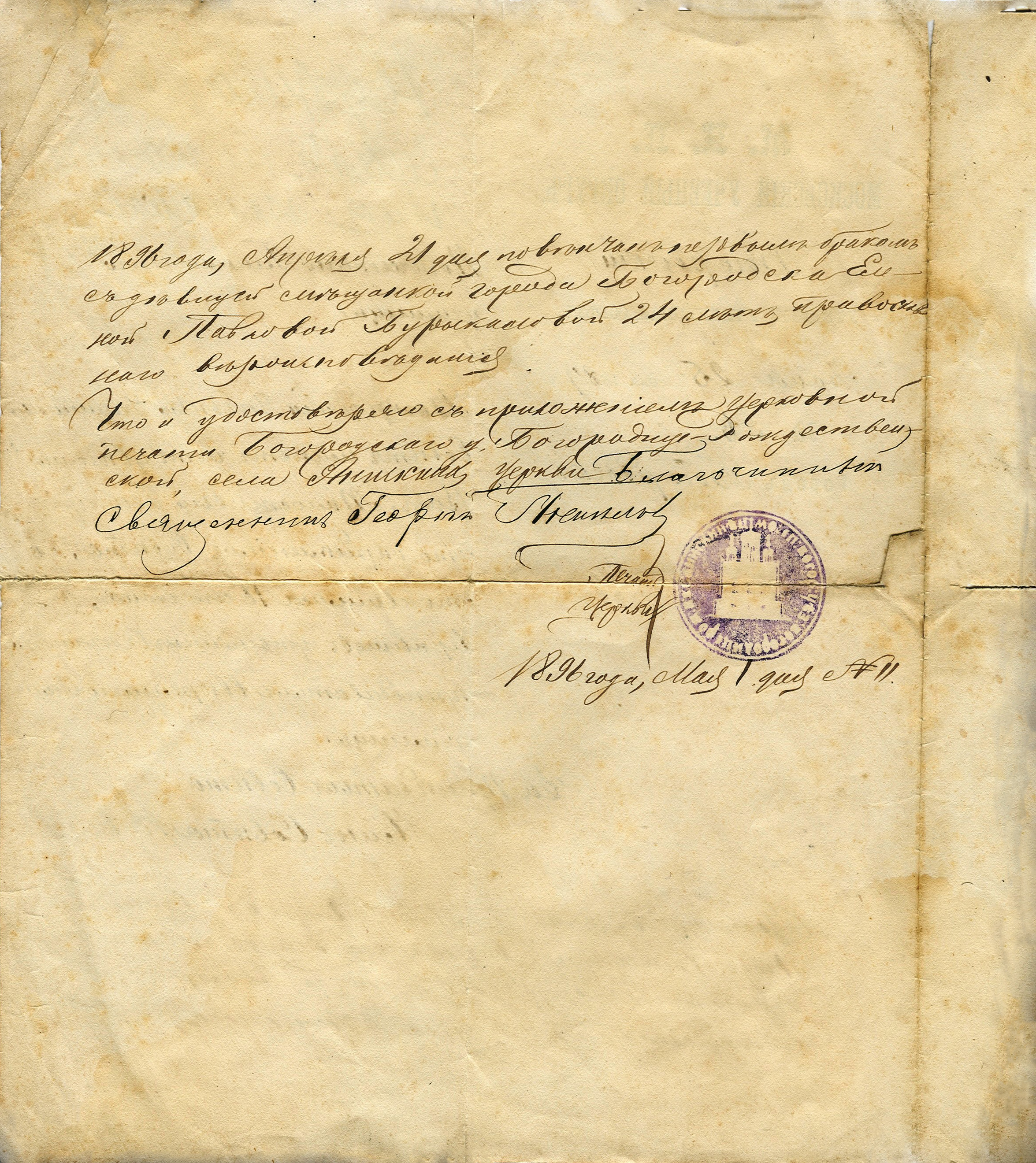 Документы Петра Петровича Чернышёва о месте работы (с 1889) и вступлении в брак в 1896 году с Еленой Павловной Бурыкаловой. 1899 год.