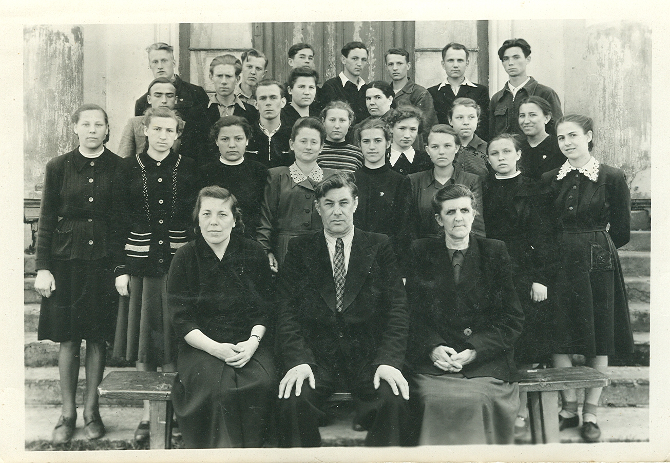 Александра Петровна Чернышёва (1897-1963); преподаватель географии (сидит справа). Свердловская ср. школа. 10 б класс, выпуск 1955 г. В центре – директор школы (С.И.) Шведов. Фото 1955 г.