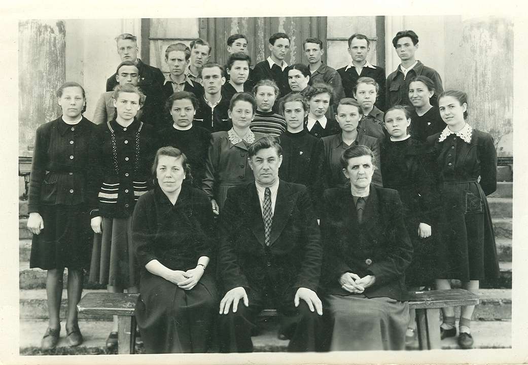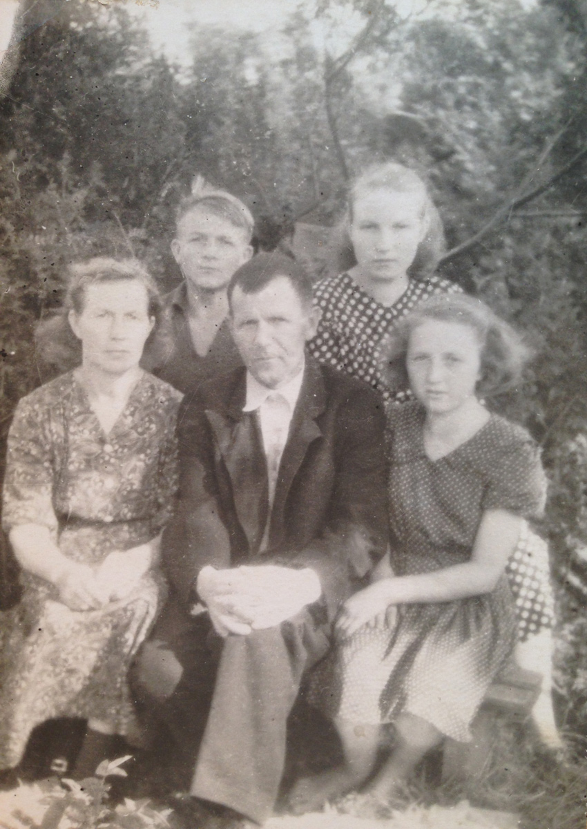 Владимир Петрович Чернышёв(первый ряд, в центре), жена Екатерина Фёдоровна, дети Елена, сидит, Виктор и Галина сзади. Фото д. Анискино, 1950 г.