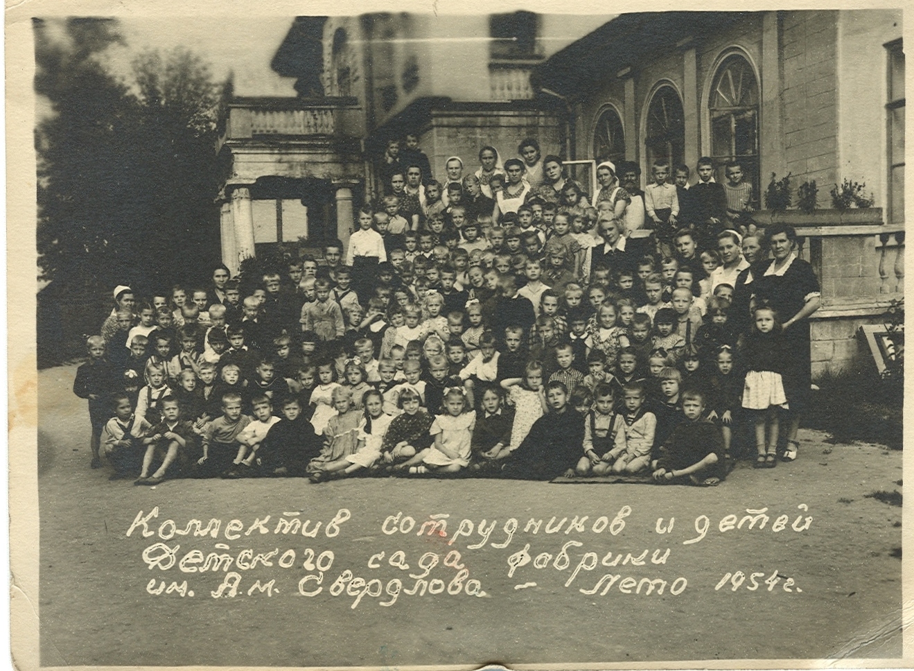 Лидия Петровна Чернышёва (1904-1972; стоит, крайняя справа) воспитательница Детского сада фабрики им. Свердлова. Фото 1954 г. Здание дачи С.И. Четверикова в Городищах, в стиле модерн, нач. 1900х г.