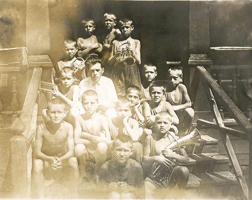 Е.П.Чернышёв, директор Детского дома в Малаховке, и воспитанники, участники духового оркестра.