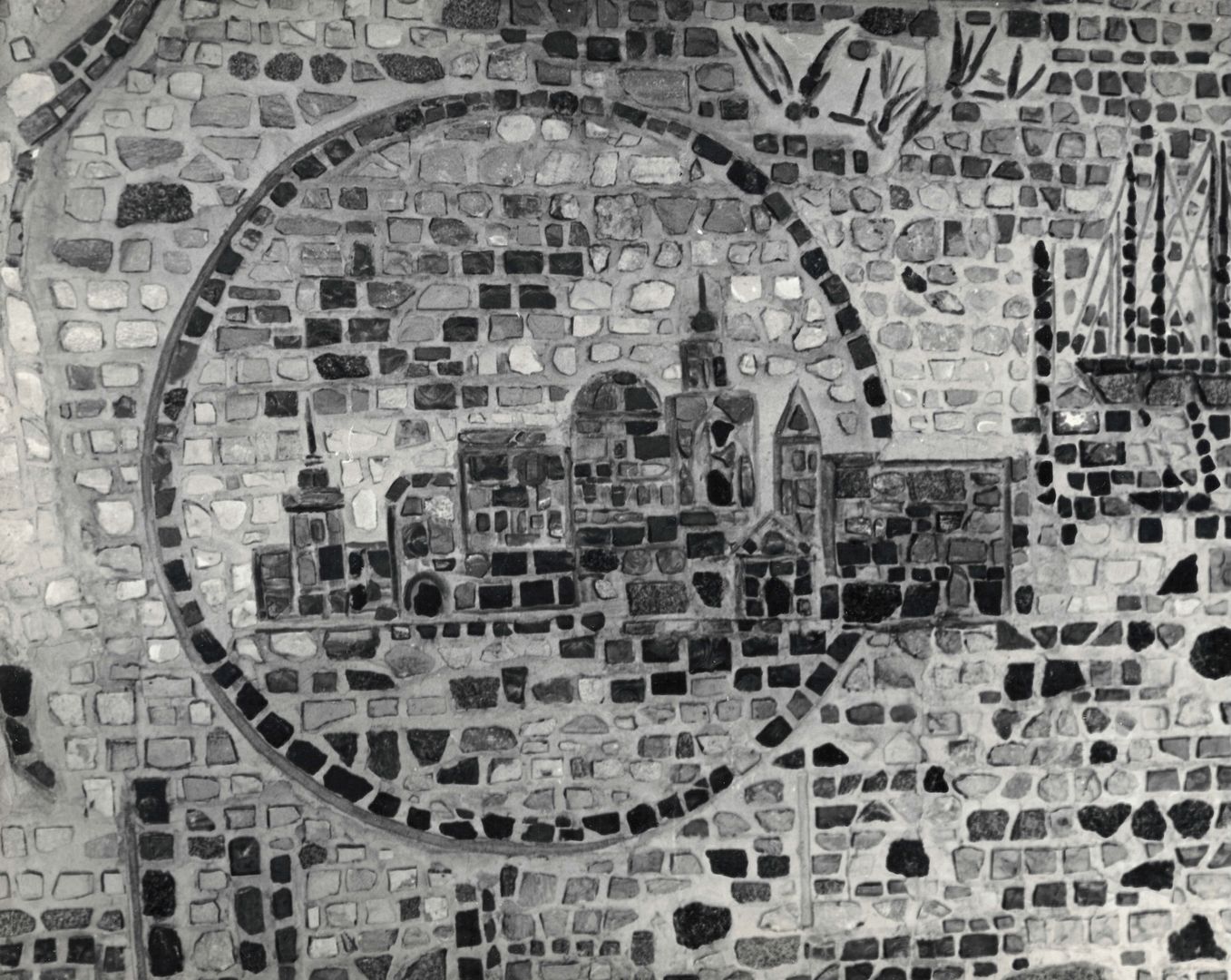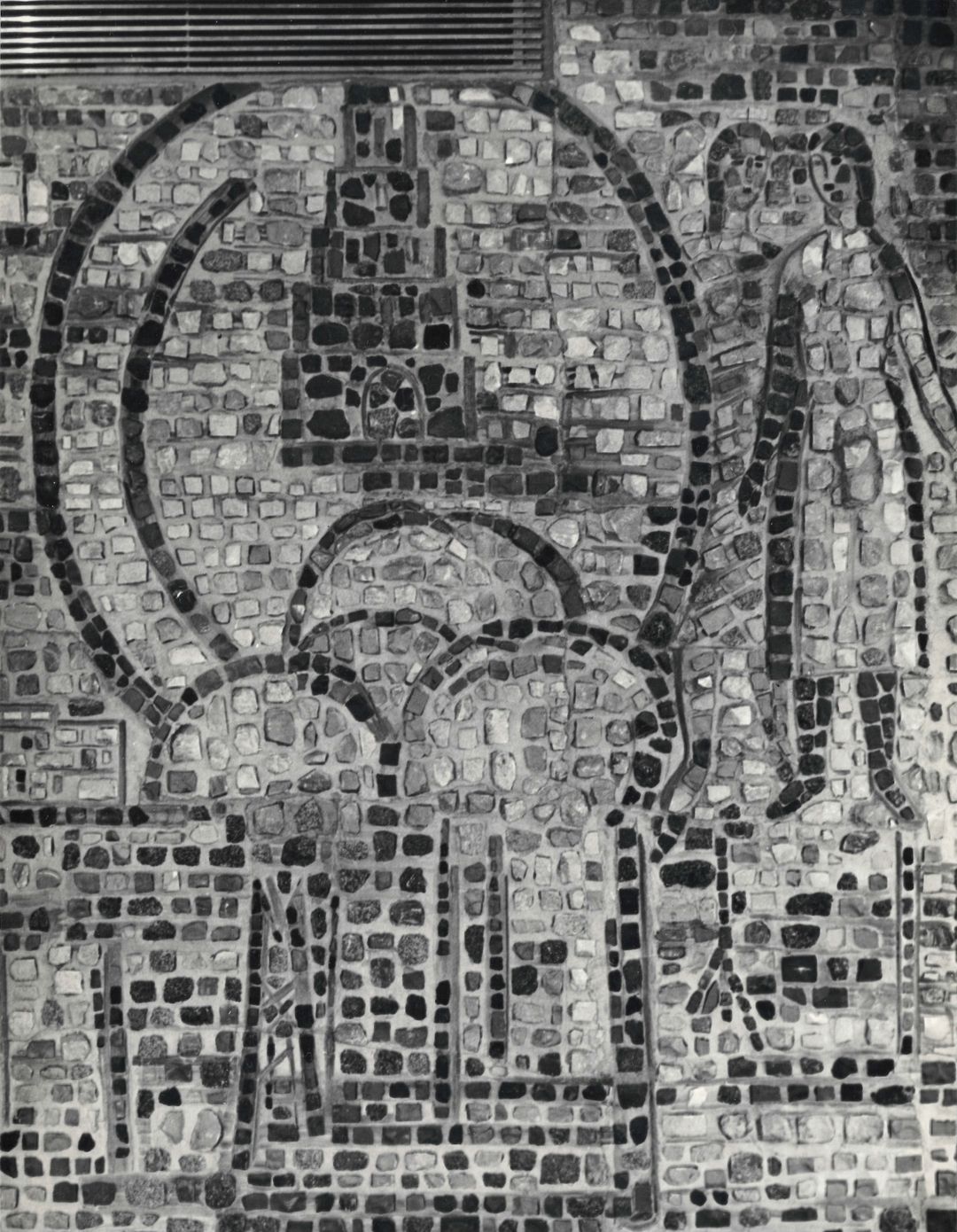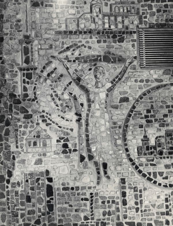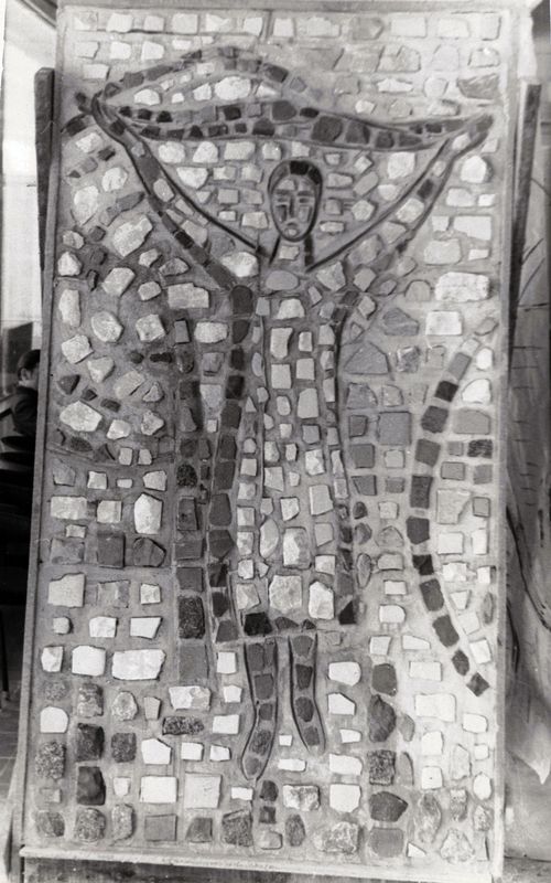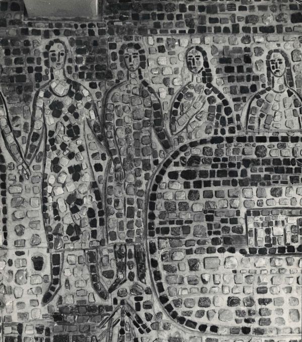 Лаконизм широкого контура, которым моделируется лицо, удивительным образом соединяется с портретностью изображения. Умение обобщенным, подчиненным стене формам, придать ощущение жизни невольно заставляет вспомнить интерес Бориса Петровича к античным мозаикам. Воспоминание это усиливается благодаря изображению над головой женщины, детали, напоминающей капитель пилястры, которая окончательно связывают голову со стеной.
